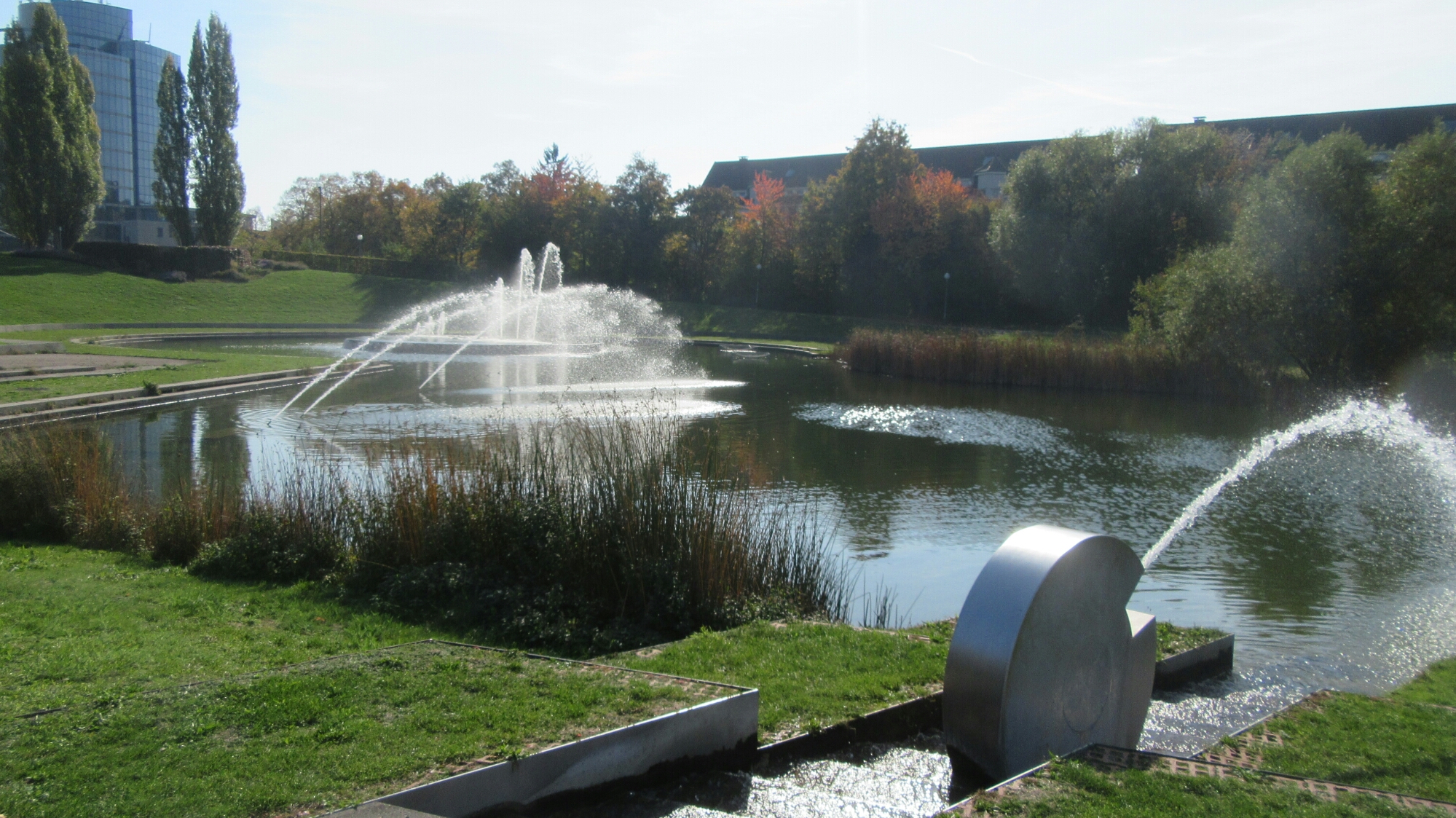 And I’m quite serious. I started out towards Hohenpark, a neat area a short walk away. I was immediately surprised by all the super modern buildings, everything here (at least in my district) looks like buildings from the future it is very awesome. There are fountains all over, and artsy things everywhere too. But in this park is the Killesbergturm, a really neat tower of sorts held up by a beam in the middle but supported and secured entirely by cables and is 132 feet tall. It looks quite unique.