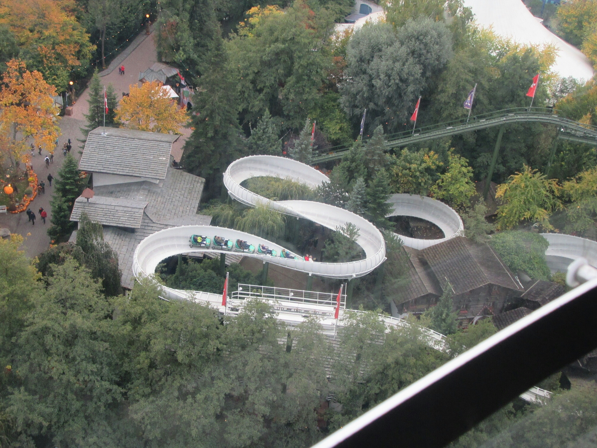 Switzerland land has a bobsled type coaster, except there’s no tracks and you are freely sliding down a bobsled track with only momentum and small small edge bumpers keepin the sled from falling off. It had anoter cool coaster heavily alpine themed where you pull forward and as if pick up by a giant hay fork the cart and section of the track is lifted up in a farm tower to begin the ride.
