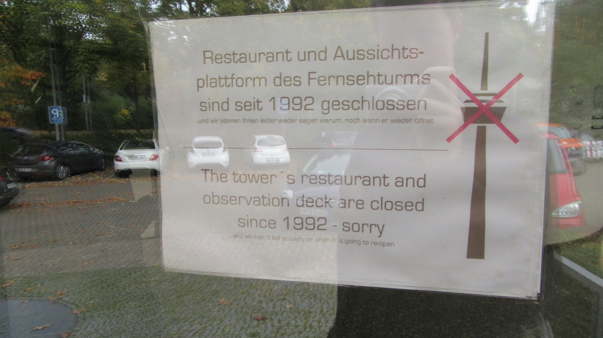 Next was a walk to Colonius, another large television tower like the ones in Berlin and Munich, this one called Colonius. As my research indicated, it might be closed, and it was. The note left on the door is very cryptic and mysterious, reeking of conspiracies (pictured below).