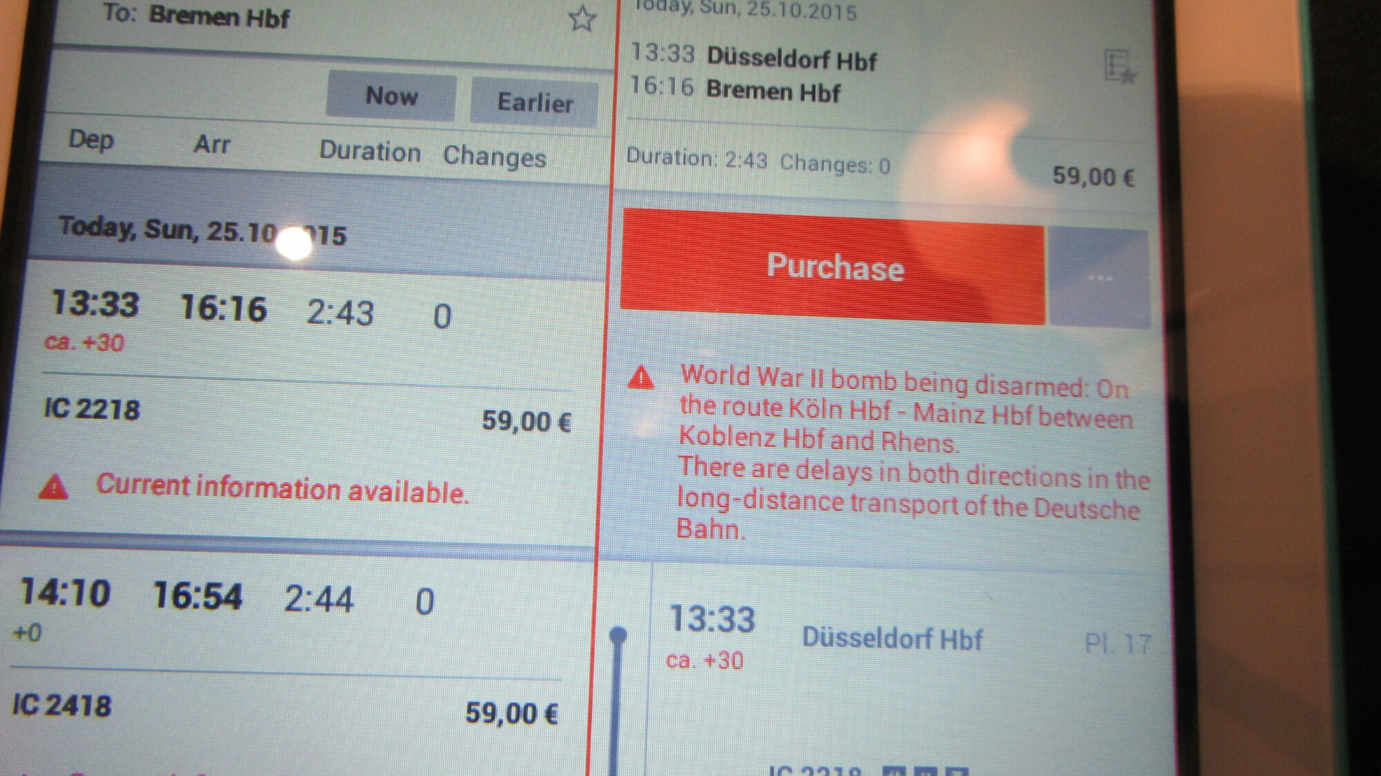 So once again (after returning from the ruins) the train to my next stop was delayed, though this time by the disarming of a bomb left over from “Welt Krieg 2” presumably found near the tracks, though a ways south near Cologne. Not only did the train schedule app say this, they also announced it was delayed by an aircraft’s bomb in the PA at the station. They still find about 1 bomb a month, and alllll construction sites are always bomb checked beforehand. The last time WW2 bombs had killed was back in 1992, to 3 unlucky construction workers. (I could be wrong but that’s what I remember.) Anyways, they said the train would be delayed by 30 mins. The app said it would be 35 minutes. It arrived in Düsseldorf 40 minutes late and arrived at my next stop exactly 60 minutes late. Come on Deutsche Bahn, let’s get it together here.