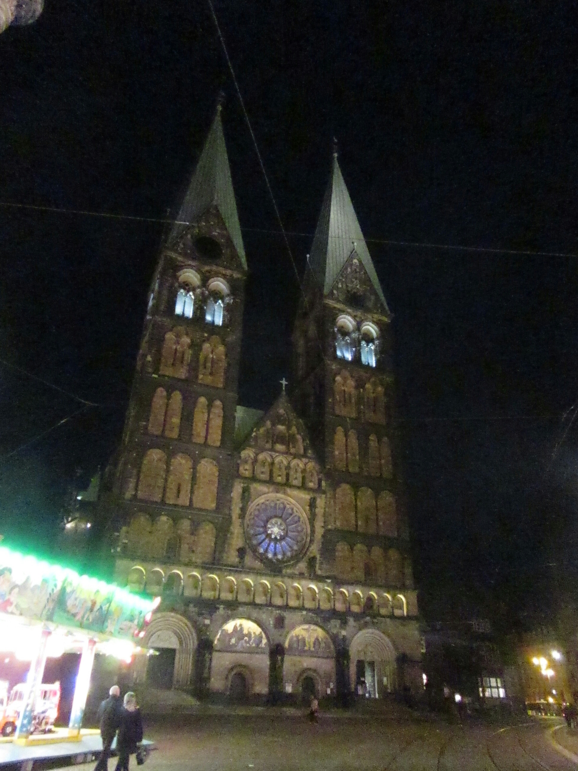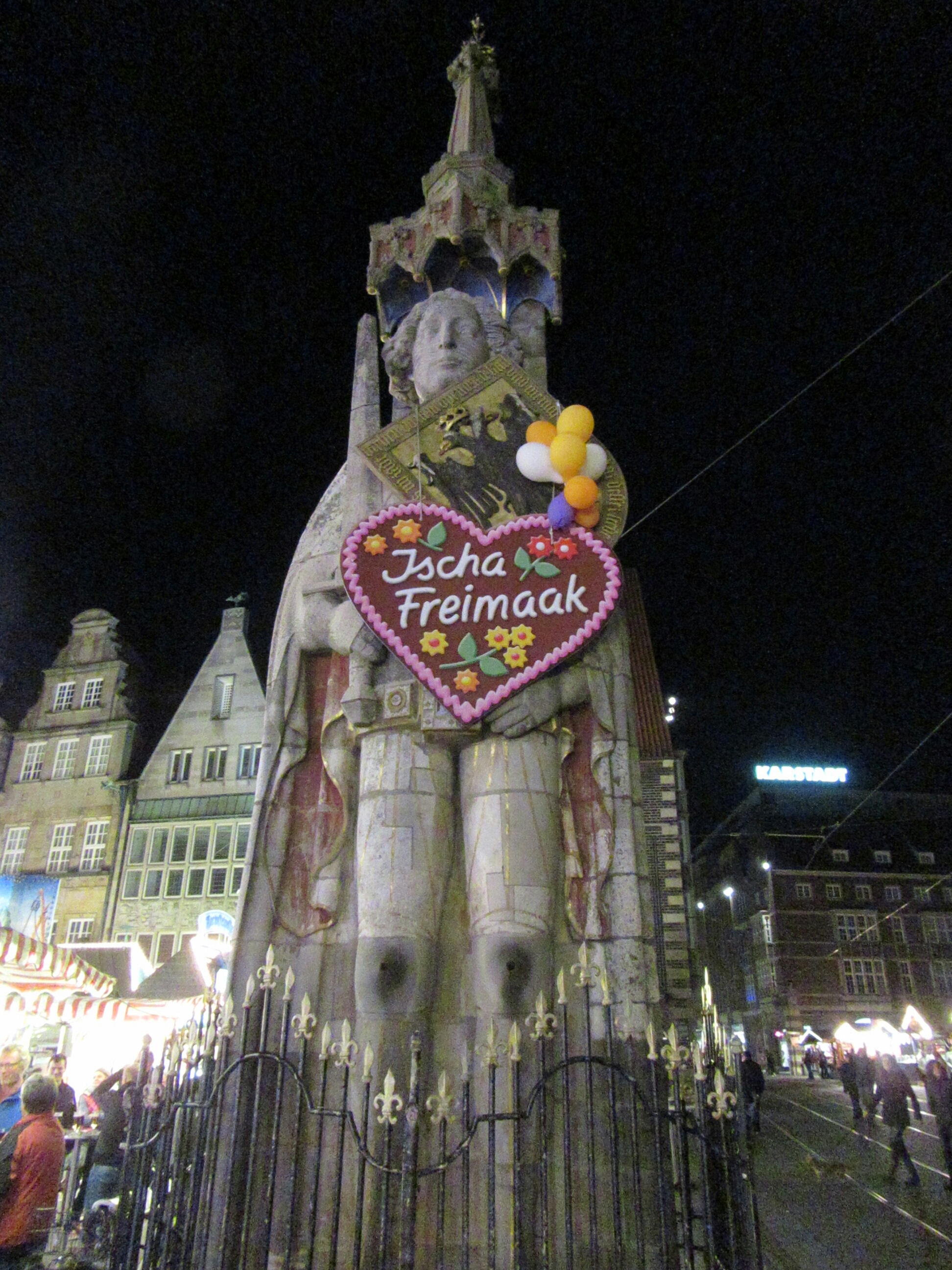 I don’t have a whole lot of cities left, but I am already glad I picked the city-state of Bremen. 3 cities in Germany are their own state, the other 2 being Berlin and Hamburg. I don’t know really anything except the city is has certainly existed since the medieval era, it definitely shows. In the old town  (by now it was getting fairly late at night) there is a really cool Rennaissance faire type thing going on, old wooden shops, and people dressed like knights and peasants, from pantaloons, to hoods cloaks and tabards. One stall even has little cross bows and stands and you gotta shoot little figures off the big castle, how neat…and brutal. Another stall was for wood carvings, and another had dozens of baskets with vials and old style glasses of (alcoholic) drinks with signs saying they are cures and remedies for various things, (different flavors of drinks, not actually trying to sell new age stuff, it was all in the medieval theme and fun).